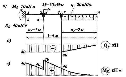 Разбиваем длину балки на отдельные участки. Границами этих участков являются точки приложения сосредоточенных усилий (активных и/или реактивных), а также точки, соответствующие началу и окончанию действия распределенной нагрузки. Таких участков в нашей задаче получается три. По границам этих участков наметим шесть поперечных сечений, в которых мы и будем вычислять значения перерезывающих сил и изгибающих моментов (рис. 3.13, а).