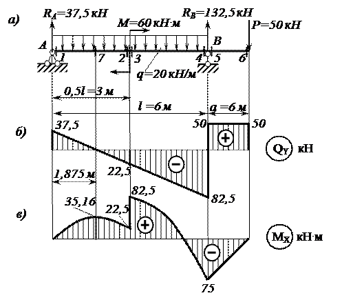На эпюре изгибающих моментов мы видим изломы под сосредоточенной силой P и под опорными реакциями. Углы изломов направлены навстречу этим силам. Под распределенной нагрузкой интенсивностью q эпюра изменяется по квадратичной параболе, выпуклость которой направлена навстречу нагрузке. Под сосредоточенным моментом – скачок на 60 кН ·м, то есть на величину самого момента. В сечении 7 на эпюре